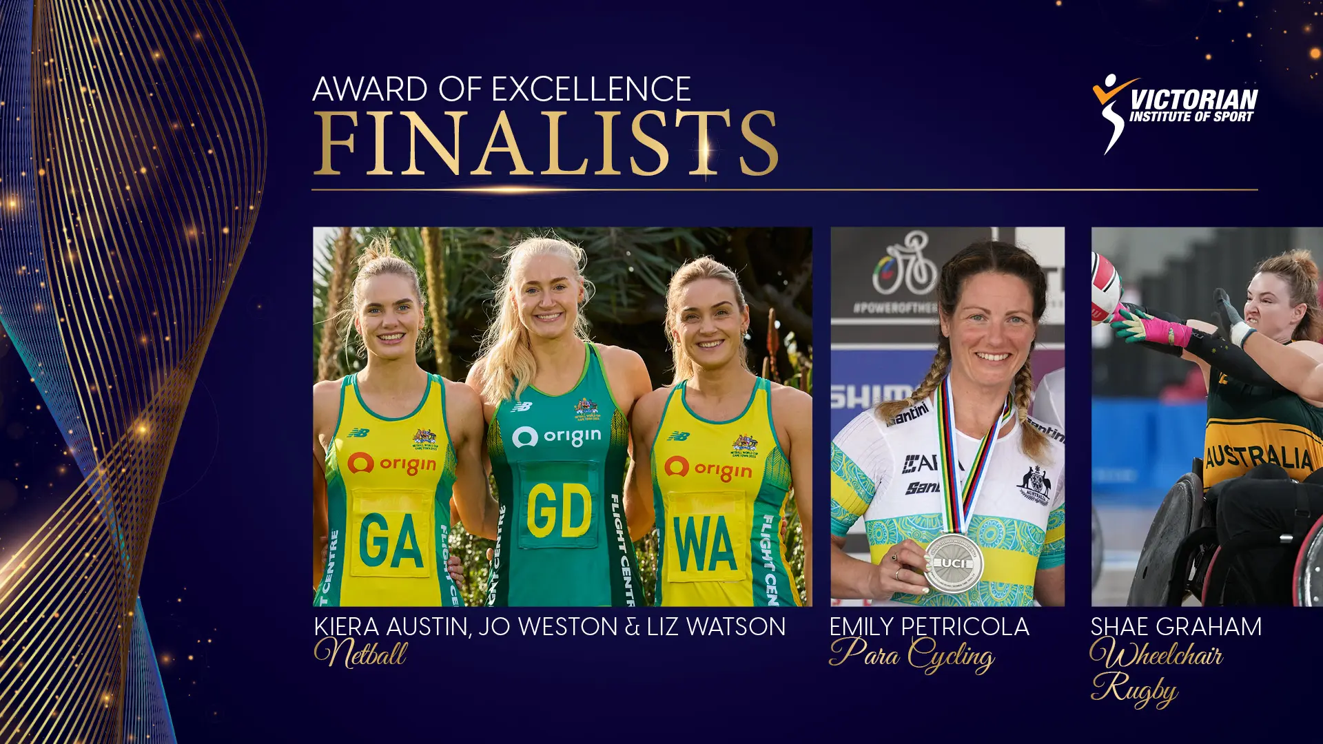 The contenders this year are Para-cycling world champion Emily Petricola, World Cup winning netballers Liz Watson, Jo Weston and Kiera Austin and world champion wheelchair rugby player Shae Graham.