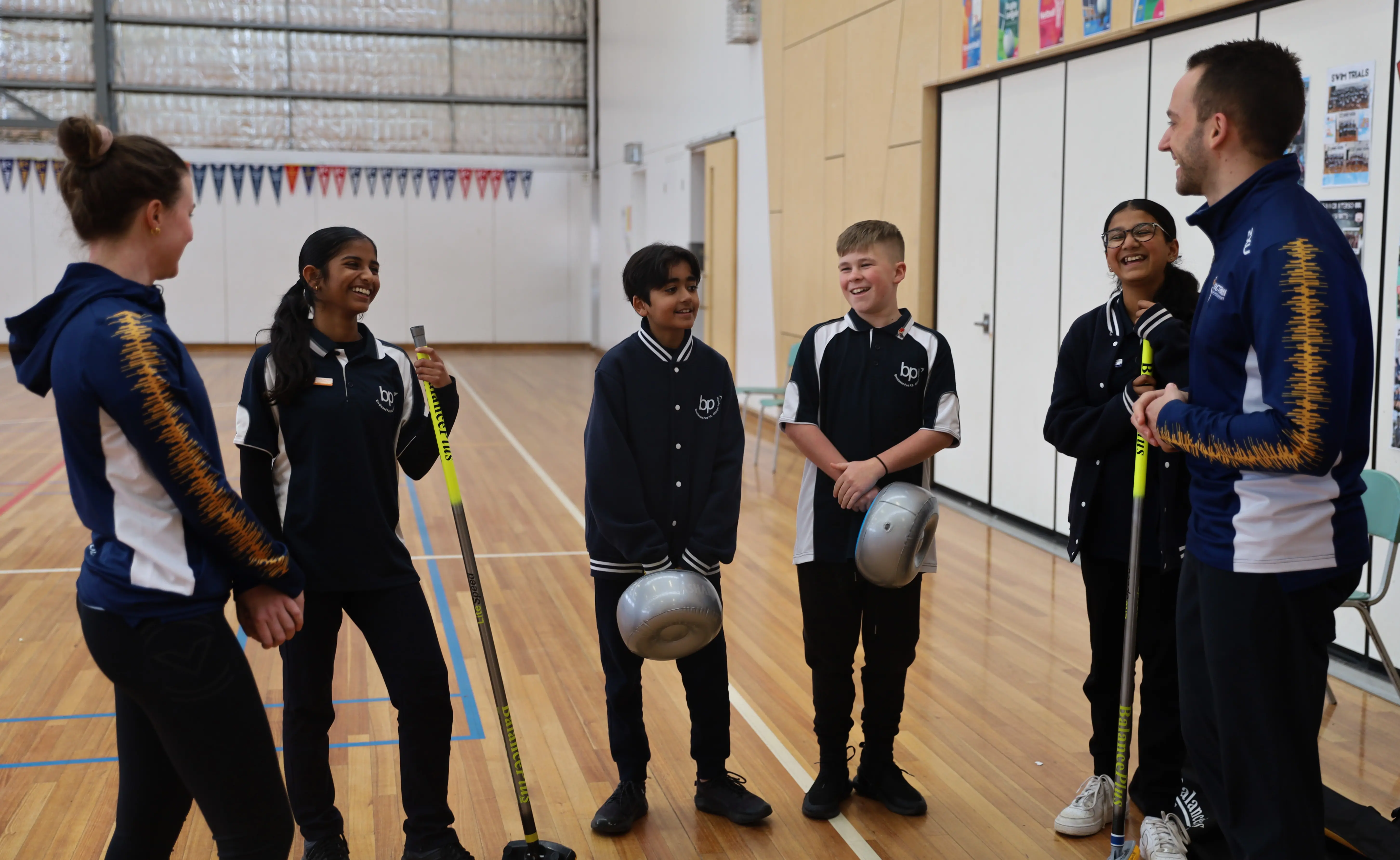 Image: Students testing out Dean Hewitt’s curling equipment.