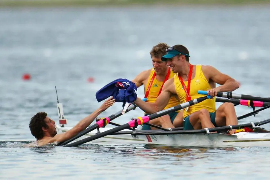 Image: Australian rowers David Crawshay and Scott Brennan are presented with a flag after their victory in the men’s double sculls final at the Beijing Olympics on August 16, 2008. Credit: Getty Images